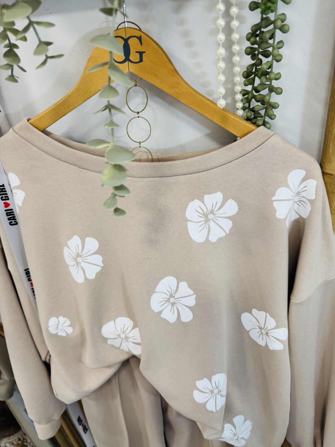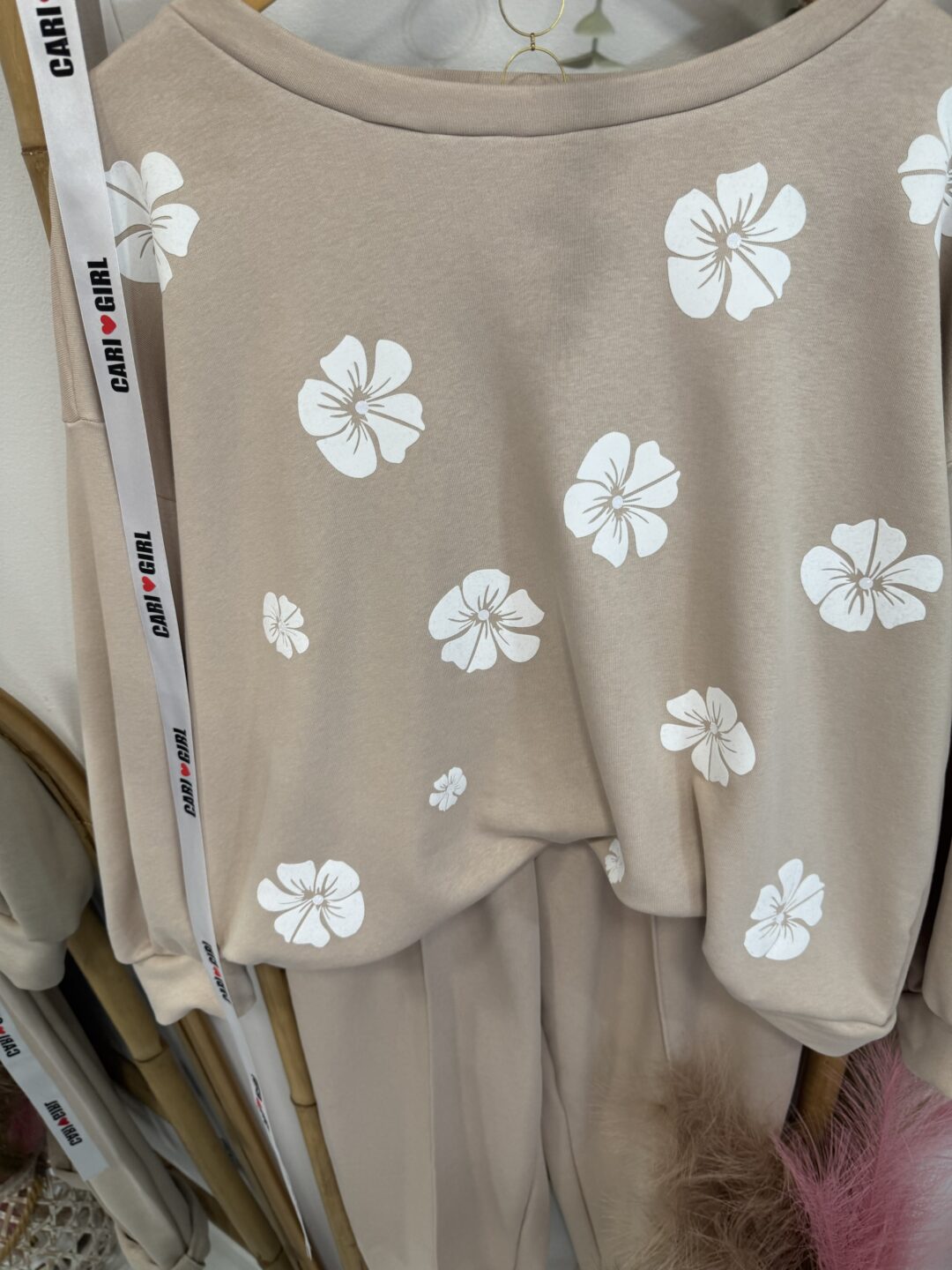 Σετ φόρμας σε ζεστή μπεζ απόχρωση, διακοσμημένο με λευκά floral στοιχεία που προσθέτουν μία ρομαντική, εκλεπτυσμένη πινελιά.