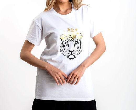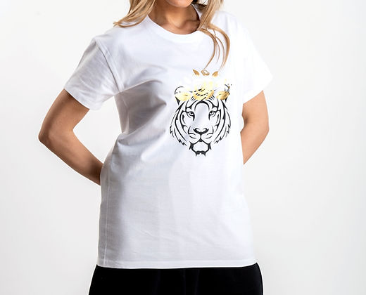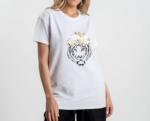 T-shirt βαμβακερή κοντομάνικη μπλούζα σε λευκό χρώμα, με soft gold mirror χρυσή και μαύρη στάμπα τίγρης.