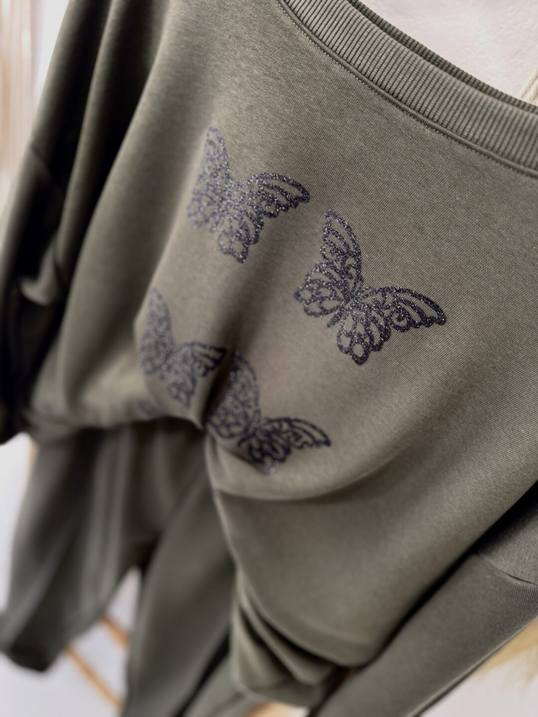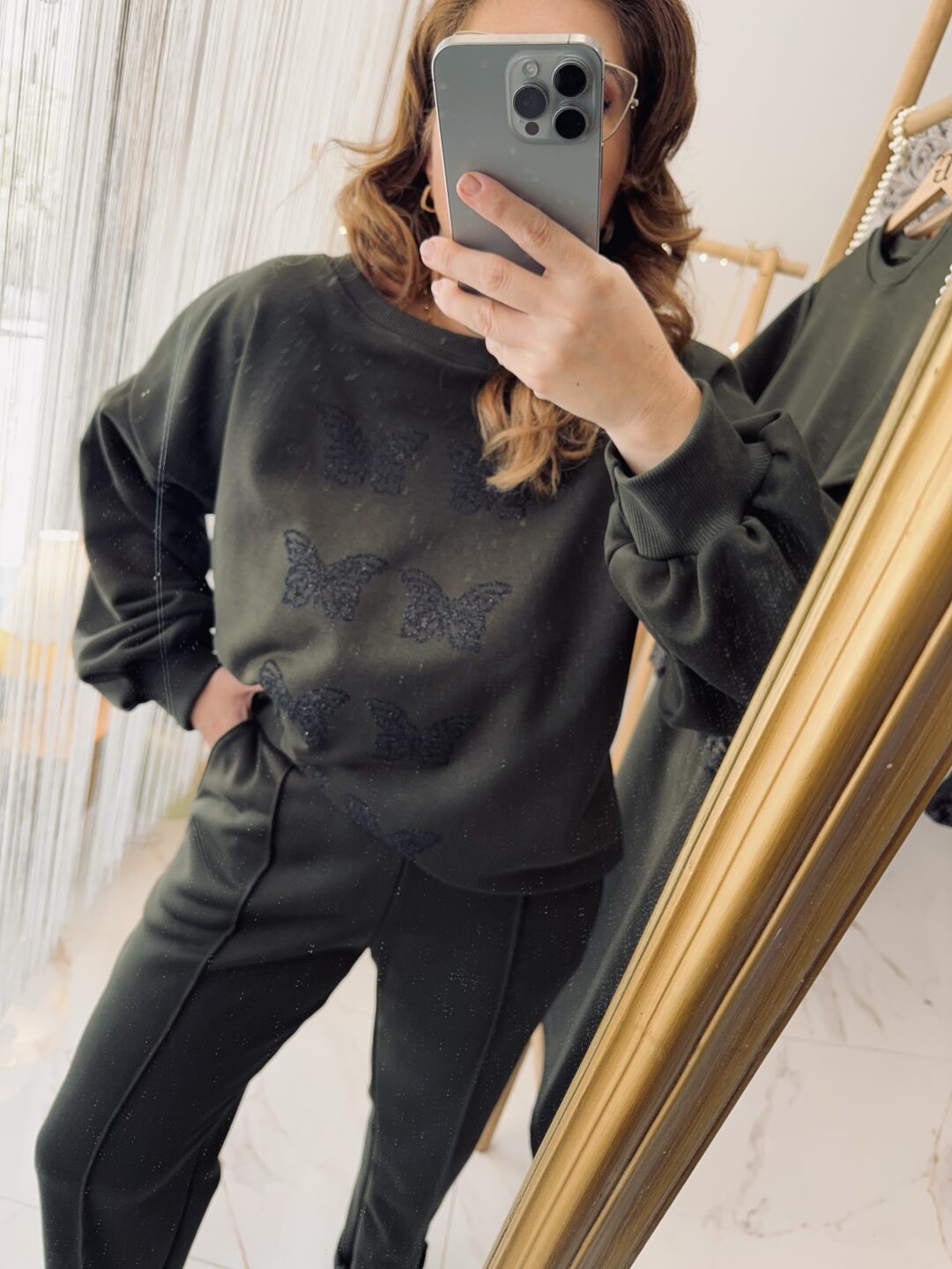 Το πιο ξεχωριστό σετ της σαιζόν στο απόλυτο λαδί χρώμα που θα σου κλέψει σίγουρα την καρδιά. Συνδυάζεται με μαύρες glitter λεπτομέρειες (πεταλούδες), δημιουργώντας ένα μοντέρνο και ταυτόχρονα ρομαντικό στυλ. Ιδανικό για όλη μέρα.